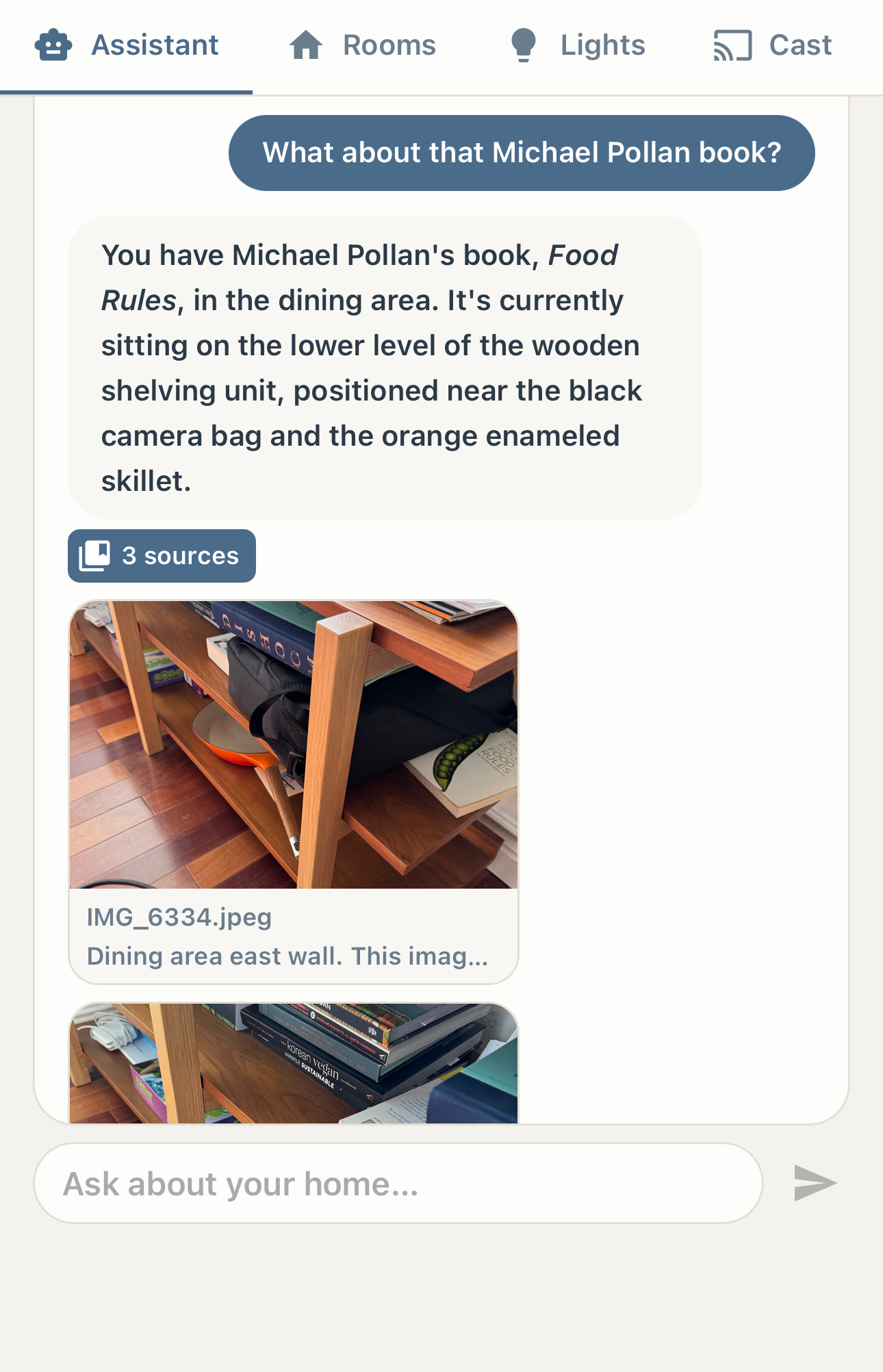 Second, my expectations for what a smart home should be had increased. In a world in which AI is taking off, a smart home to me is one that can answer arbitrary questions about itself, or better yet, one in which a robot could come in and help out. Do I need to pick up dishwasher detergent on the way home? Where did I leave that book by Michael Pollan? Or where did I leave the keys? That would require distilling and understanding properties about our home, as well as their spatial relationships with each other for a robot helper.