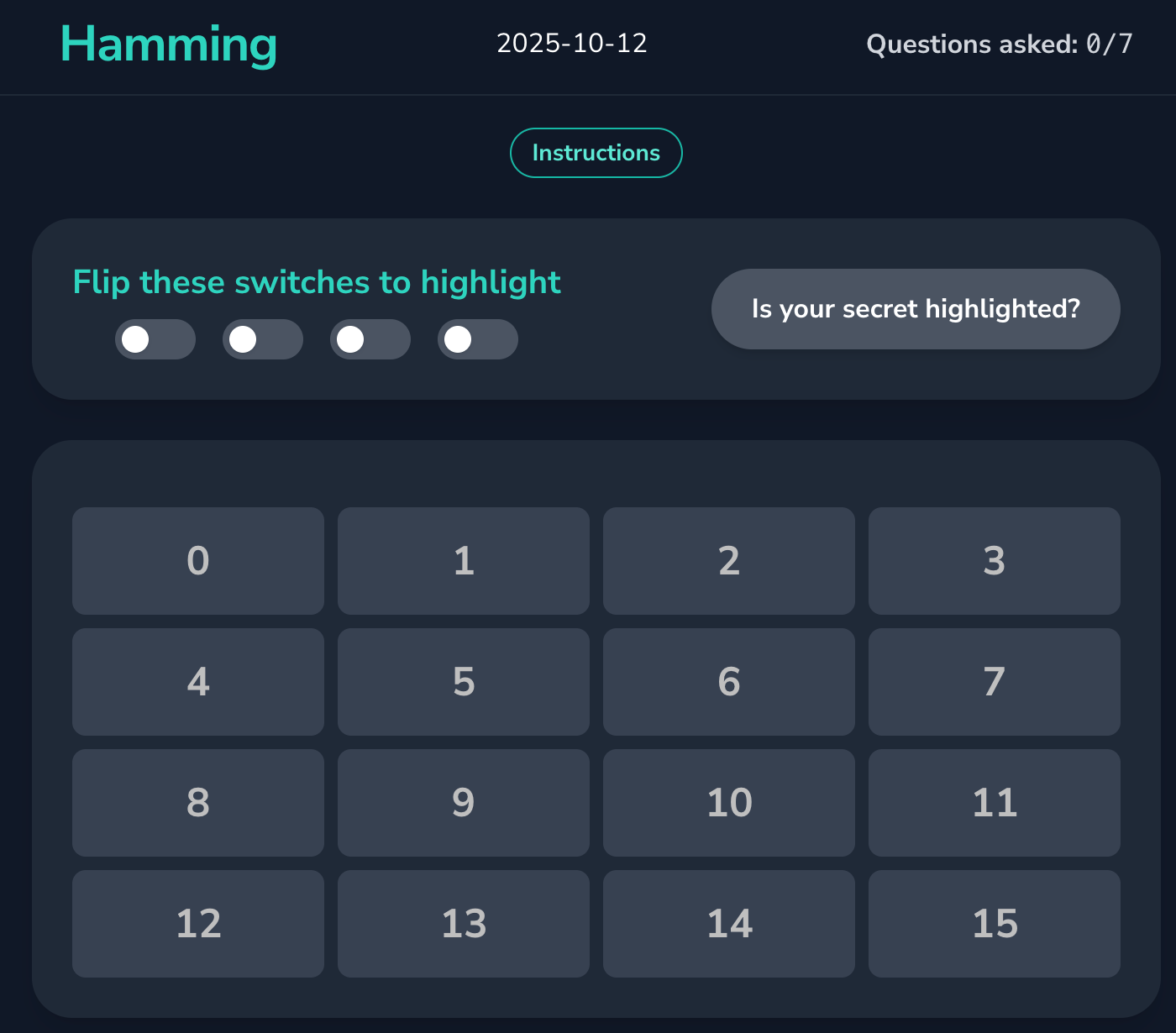 Each game of Hamming is a puzzle where you get 7 rounds of questions to find a mystery number, but one of the answers will be a lie, i.e. the opposite of the truthful answer to the question.